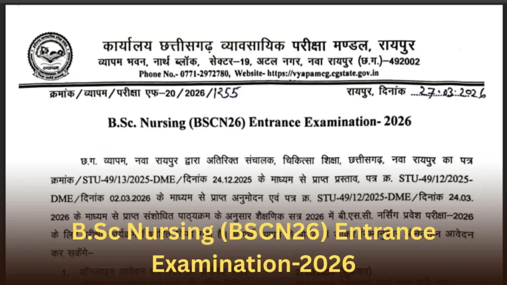 अगर तुम भी B.Sc Nursing का सपना देख रहे हो और छत्तीसगढ़ में सरकारी कॉलेज में एडमिशन लेना चाहते हो, तो ये पोस्ट तुम्हारे लिए बिल्कुल परफेक्ट टाइमिंग पर है। आज मैंने छत्तीसगढ़ व्यापम (Vyapam) का ताज़ा प्रेस नोट पढ़ा है जो 27 मार्च 2026 को जारी हुआ है। ये B.Sc Nursing (BSCN26) Entrance Examination-2026 की पूरी डिटेल्स है। मैंने इसे बहुत ध्यान से पढ़ा है और अब तुम्हें दोस्ताना भाषा में, बिल्कुल consultative तरीके से, step-by-step समझा रहा हूँ – जैसे घर बैठे कोई बड़ा भाई या दीदी तुम्हें गाइड कर रहा हो।