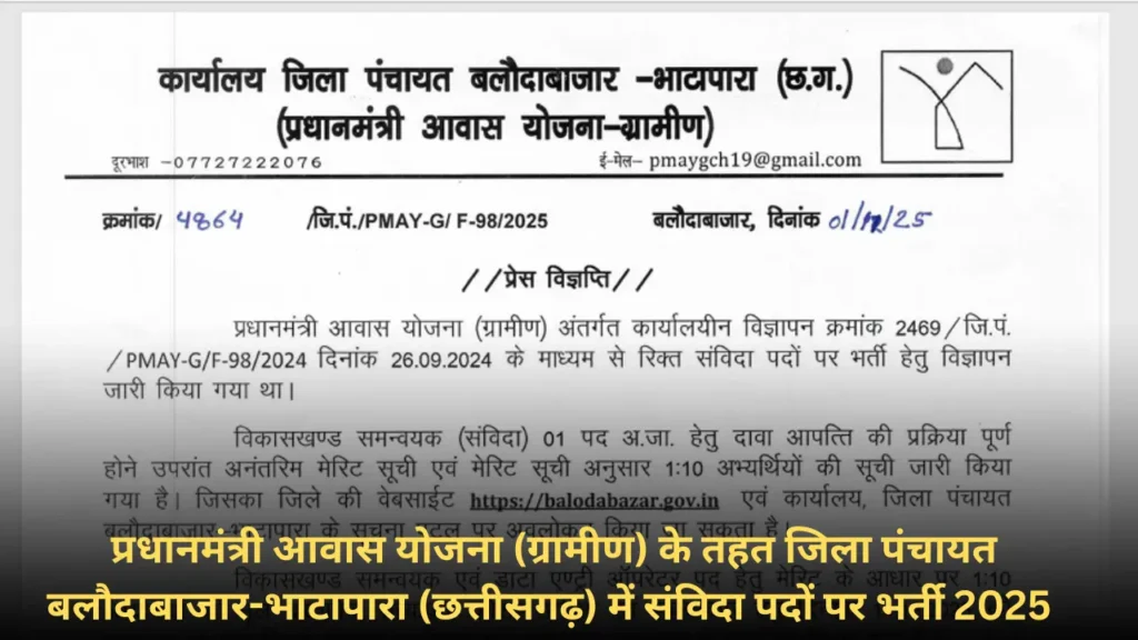 प्रधानमंत्री आवास योजना (ग्रामीण) के तहत जिला पंचायत बलौदाबाजार-भाटापारा (छत्तीसगढ़) में संविदा पदों पर भर्ती 2025