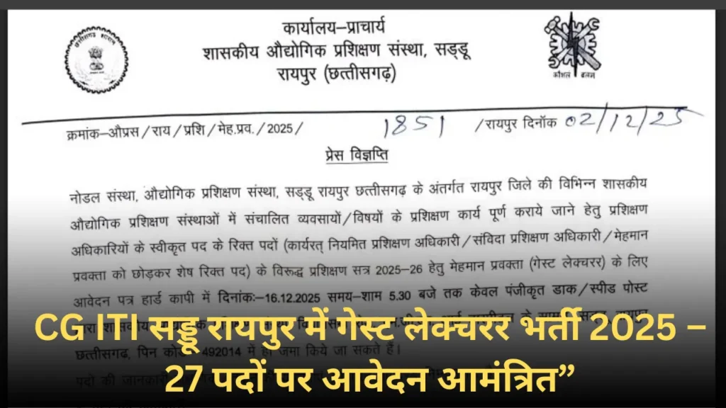 शासकीय औद्योगिक प्रशिक्षण संस्था (ITI), सड्डू, रायपुर, छत्तीसगढ़ ने प्रशिक्षण सत्र 2025-26 के लिए विभिन्न ITI में मेहमान प्रवक्ता (Guest