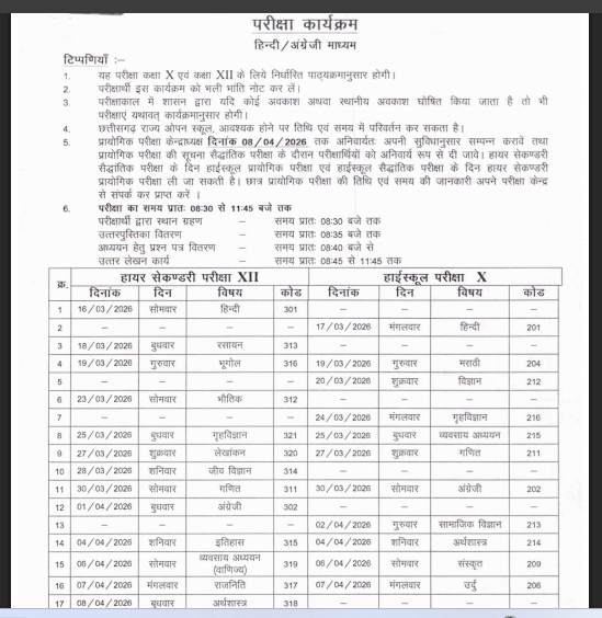 हाल ही में छत्तीसगढ़ राज्य ओपन स्कूल, रायपुर द्वारा मार्च-अप्रैल 2026 की परीक्षाओं के लिए विस्तृत समय-सारिणी (Timetable) जारी कर दी गई है