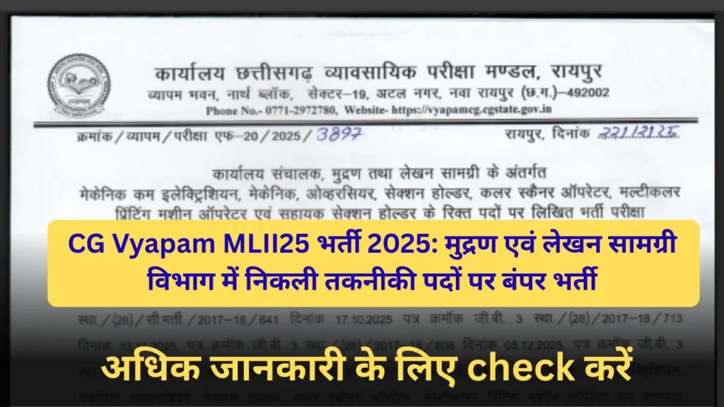 exam का नाम – मुद्रण तथा लेखन सामग्री के अंतर्गत मेकेनिक कम इलेक्ट्रिशियन, मेकेनिक, ओव्हरसियर, सेक्शन होल्डर, कलर स्कैनर ऑपरेटर, मल्टीकलर प्रिंटिंग मशीन ऑपरेटर एवं सहायक सेक्शन होल्डर के रिक्त पदों