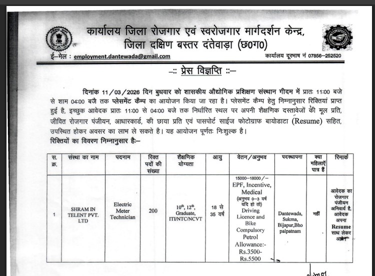 10वीं/12वीं पास युवा ध्यान दें! Dantewada Placement Camp 11 मार्च | 200 पद Electric Meter Technician | फ्री इंटरव्यू