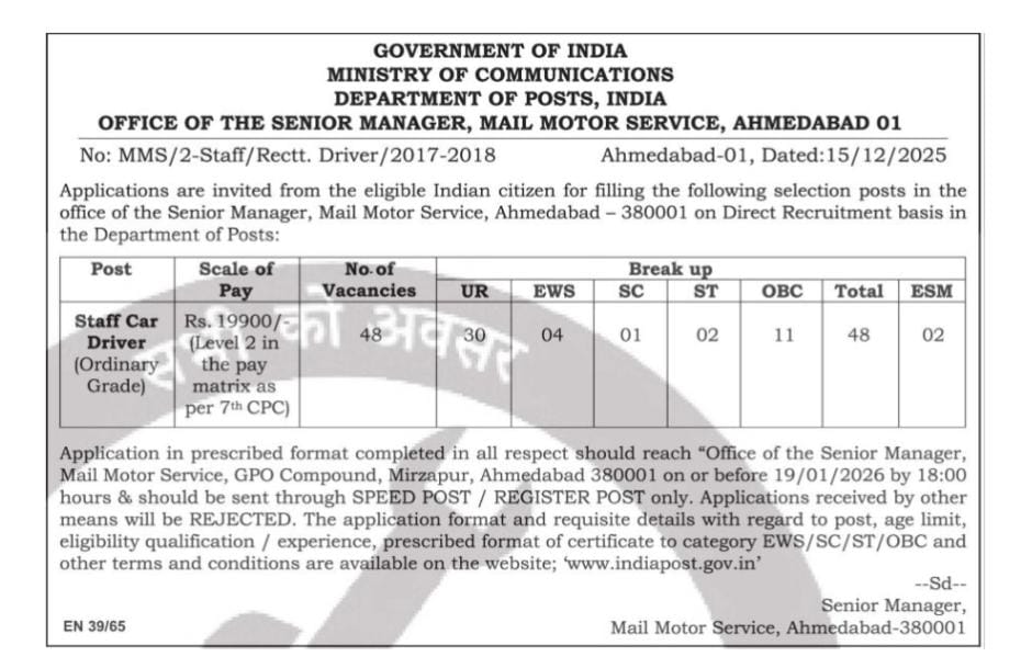 अहमदाबाद स्थित ‘मेल मोटर सर्विस’ (Mail Motor Service) ऑफिस ने स्टाफ कार ड्राइवर (Staff Car Driver – Ordinary Grade) के पदों पर सीधी भर्ती के लिए आवेदन मांगे हैं। यह उन लोगों के लिए बेहतरीन मौका है जिनके पास ड्राइविंग का अनुभव है और जो एक सम्मानजनक सरकारी नौकरी चाहते हैं।