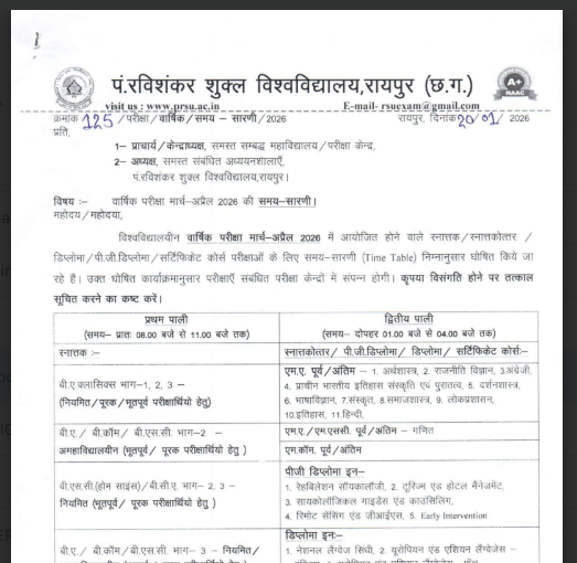 दोस्तों, पंडित रविशंकर शुक्ल विश्वविद्यालय, रायपुर ने वर्ष 2026 की वार्षिक परीक्षाओं के लिए टाइम-टेबल जारी कर दिया है । ये परीक्षाएँ मार्च और अप्रैल के महीने में आयोजित की जाएँगी ।