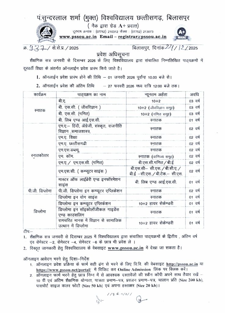 पंडित सुंदरलाल शर्मा (मुक्त) विश्वविद्यालय छत्तीसगढ़, बिलासपुर ने शैक्षणिक सत्र जनवरी-दिसंबर 2026 के लिए प्रवेश अधिसूचना जारी कर दी है । इस यूनिवर्सिटी को नैक (NAAC) द्वारा A+ ग्रेड मिला हुआ है, जो इसकी शिक्षा की गुणवत्ता को दर्शाता है