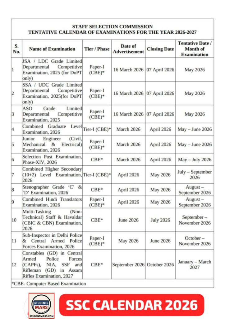 यह एसएससी द्वारा जारी किया गया एक आधिकारिक शेड्यूल (Tentative Calendar) है । इसमें बताया गया है कि साल 2026 में कौन-सी भर्ती कब आएगी, उसके फॉर्म कब भरे जाएंगे और आपकी परीक्षा किस महीने में होगी । इसे आप अपनी तैयारी का “टाइम-टेबल” मान सकते हैं।